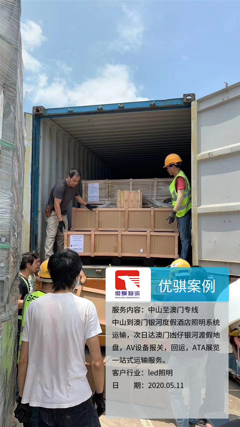 業務內容:中山到澳門銀河度假酒店照明系統運輸,次日達澳門凼仔銀河渡假地盤,AV設備報關,回運,ATA展覽一站式運輸服務。客戶行業:LED照明客戶來源:老客戶介紹自從我們中山優騏物流開通了中山至澳門的物流專線以后,很多原來物流的同行都介紹業務過來。這個客戶是從中山發燈具到澳門,整個AV設備報關,回運,ATA展覽都是我們完成,獲得了客戶的一致好評,期待下一次的合作。