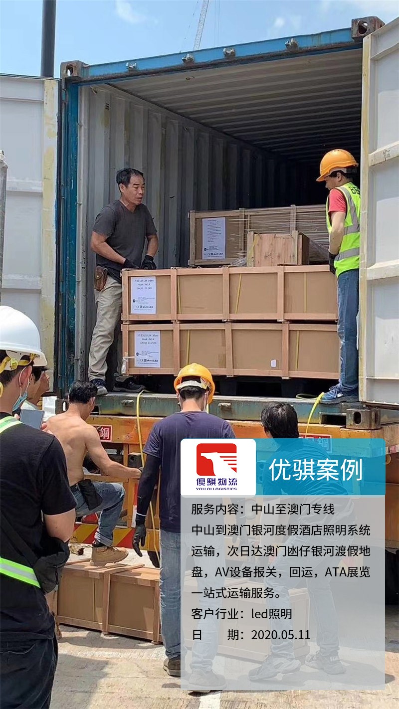 業務內容:中山到澳門銀河度假酒店照明系統運輸,次日達澳門凼仔銀河渡假地盤,AV設備報關,回運,ATA展覽一站式運輸服務。